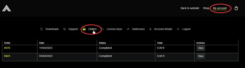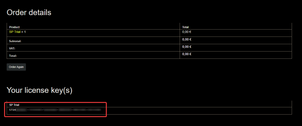 From the order history, you are able to click on each individual order, and check the license(s) associated with that order, and the corresponding license key for each of the licenses.