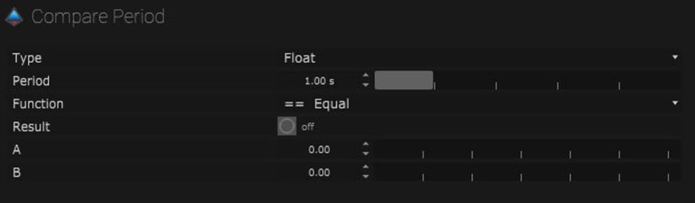 This node compares two input values and outputs the result if the value is true, this output lasts for a period of time which can be set.