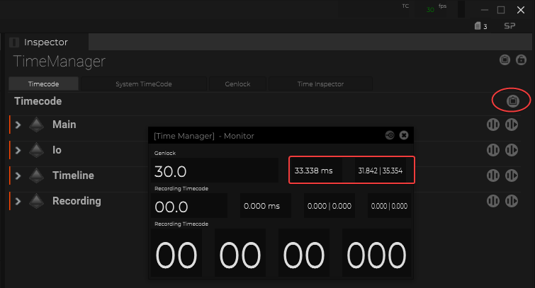 There is a Time Manager Monitor that can be access from the Time Manager – Timecode tab at the top right corner.