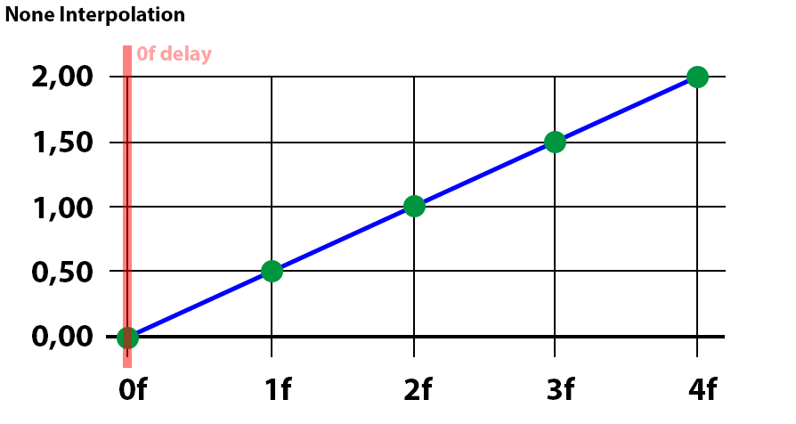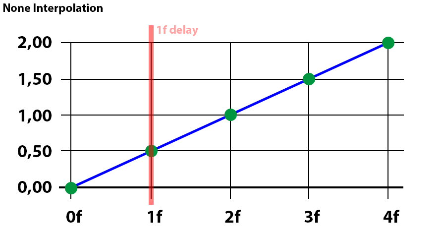 If the incoming data packages reach Stage Precision at 5ms (Project rate 50fps/20ms), the interpolated data will be influenced 75% from frame 0 and 25% from frame 1.