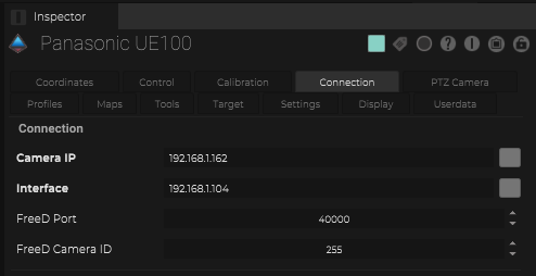 - Within the selected PTZ camera object, in the Connection tab inside the Inspector