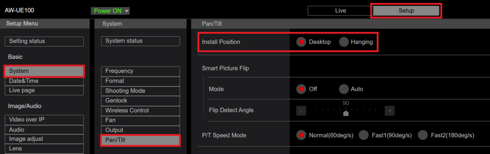 Within the Web Configuration Tool of the Panasonic PTZ camera, there is the option to configure how the camera is mounted.
