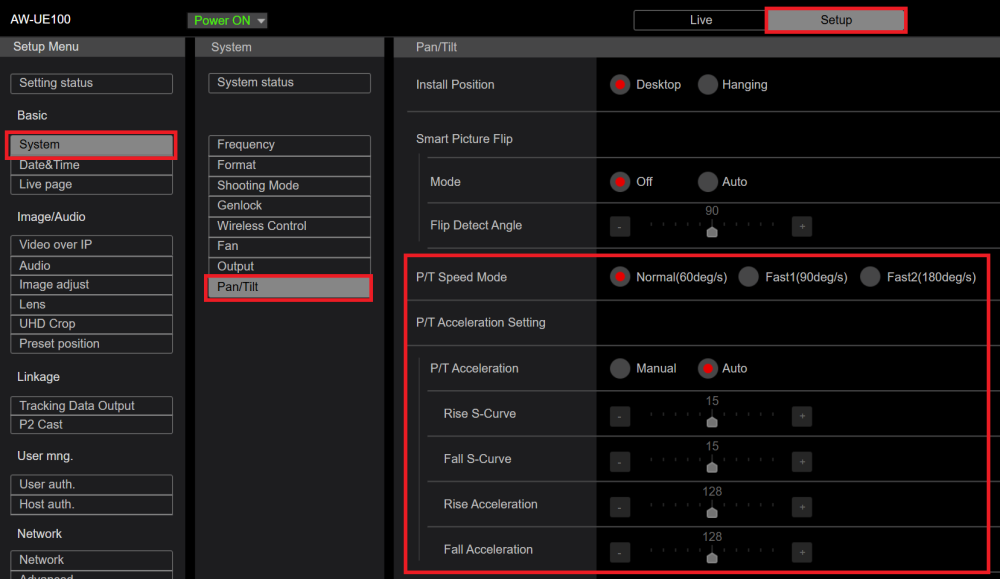 These settings can be found under the Web Configuration Tool, in the System – Pan/Tilt section, under the P/T Speed Mode, and P/T Acceleration Setting