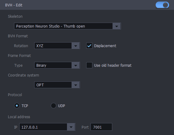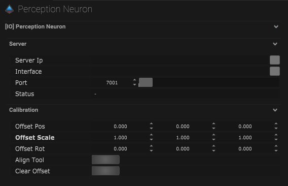 Perception neuron is a motion capture suit with skeleton data. The IO connection takes in the perception neuron data.
