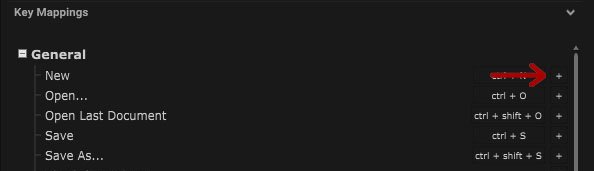 - To add a new keyboard shortcut press the + button and this will open the key mapping pop-up.