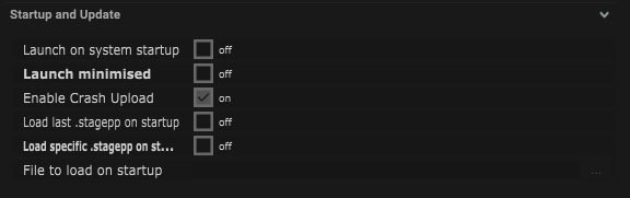 | Load last .stagepp on startup | When on the last project file will be opened when SP is started up. |