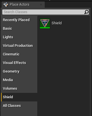 Within the “Place Actor” windows, select the category Shield and drag the Shield Actor in the level.